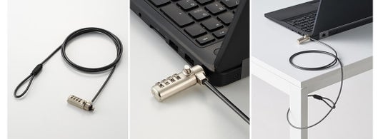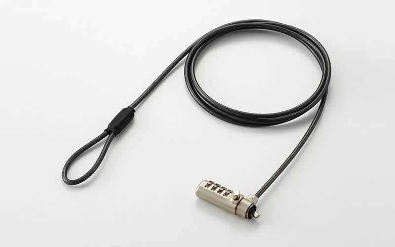 4桁ダイヤル式ロックを採用したセキュリティワイヤーロックで、キーを使用しないため紛失の心配がありません。ダイヤル番号は任意の番号に設定でき、スリムヘッドの採用により薄型ノートパソコンにも対応します。ヘッド部は360度回転し、セキュリティスロットの位置にあわせたワイヤーの取り回しが可能です。ワイヤーには、周囲を傷付けにくいコーティング処理が施されています。端末側のスロットの仕様にあわせて選べるよう、MiniSaver(3×7mm)互換モデル、NobleWedge(3.2×4.5mm)互換モデル、NanoSaver(2.5×6mm)互換モデルの3モデルをラインアップ。大切な機器を盗難から守るセキュリティ対策として、ぜひご活用ください。