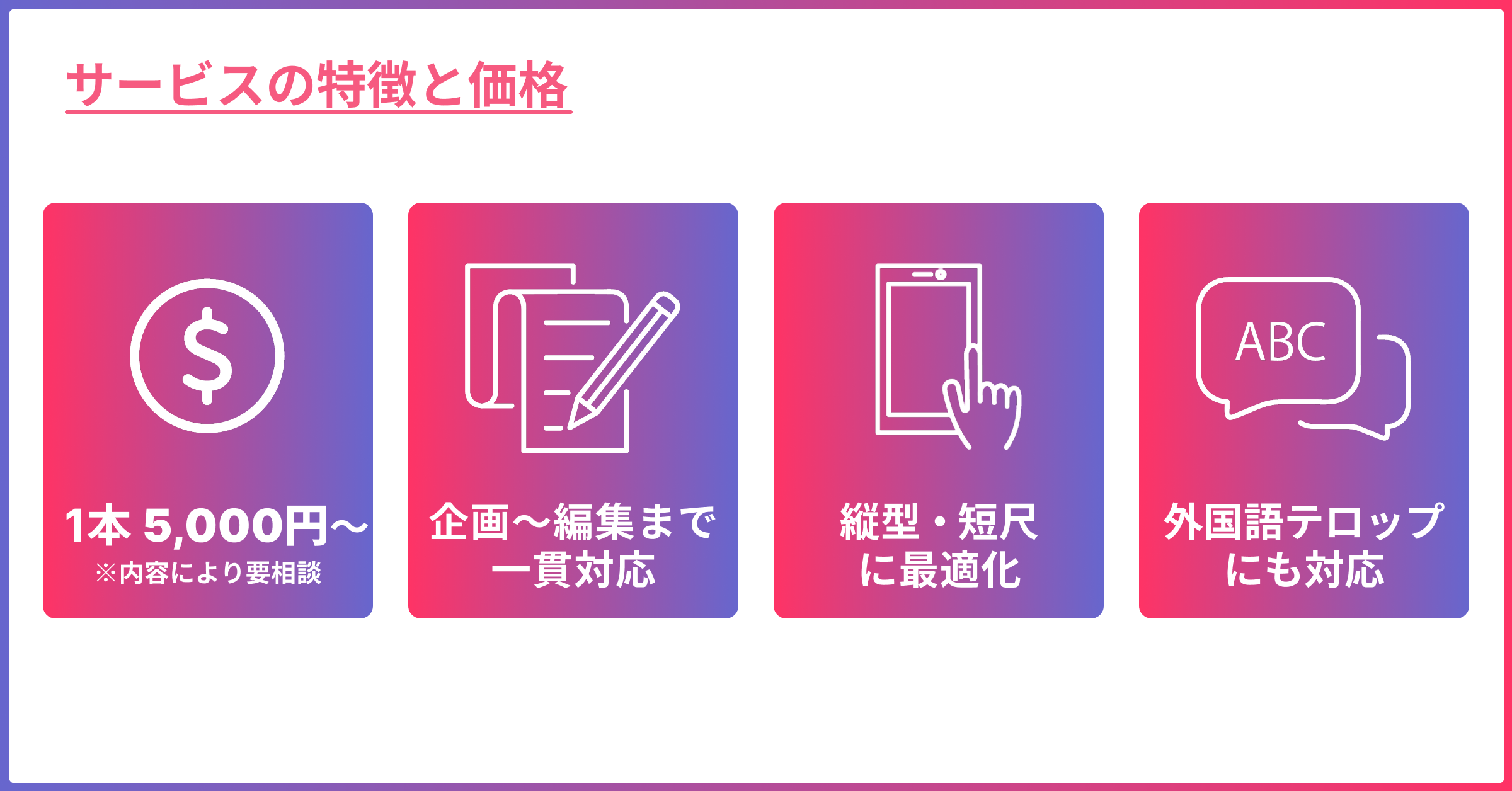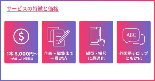 本サービスでは、1本あたり5,000円~の導入しやすい価格帯で、ショート動画制作を提供しています。企画・構成から編集までを一貫して対応し、スピード感と一定のクオリティを両立した制作体制が特長です。