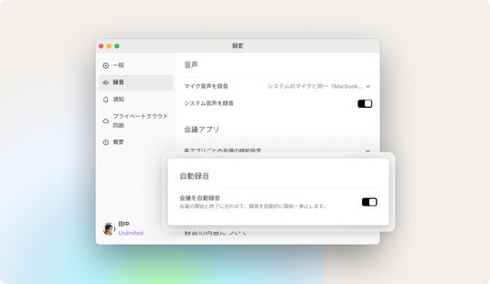 会議開始を自動検知し、ワンクリックで録音を開始できるため、招待設定や録り逃しの心配がなく、より自然でスムーズな会議体験を実現します。