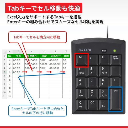 本商品はExcelでのセル移動や関数選択がスムーズになる「Tab」キーと、高額入力時に便利な「00」キーを搭載した有線テンキーボードです。