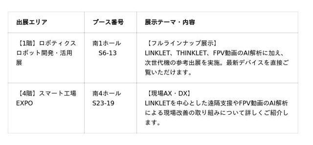 今回は、「ロボティクス ロボット開発・活用展」と「スマート工場 EXPO」の計2箇所にブースを出展し、首掛け型ウェアラブルデバイス「THINKLET」や遠隔支援ソリューション「LINKLET」に加え、新サービス「一人称視点(FPV)動画解析プラン」の先行体験および今後提供予定の次世代機の参考出展を実施いたします。