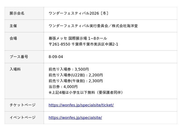 APPLE TREE株式会社(所在地:大阪府大阪市/代表取締役社長:朴秀明)は、2026年2月8日(日)に幕張メッセで開催される、世界最大級の造形・フィギュアイベント 「ワンダーフェスティバル2026[冬]」 に出展いたします。