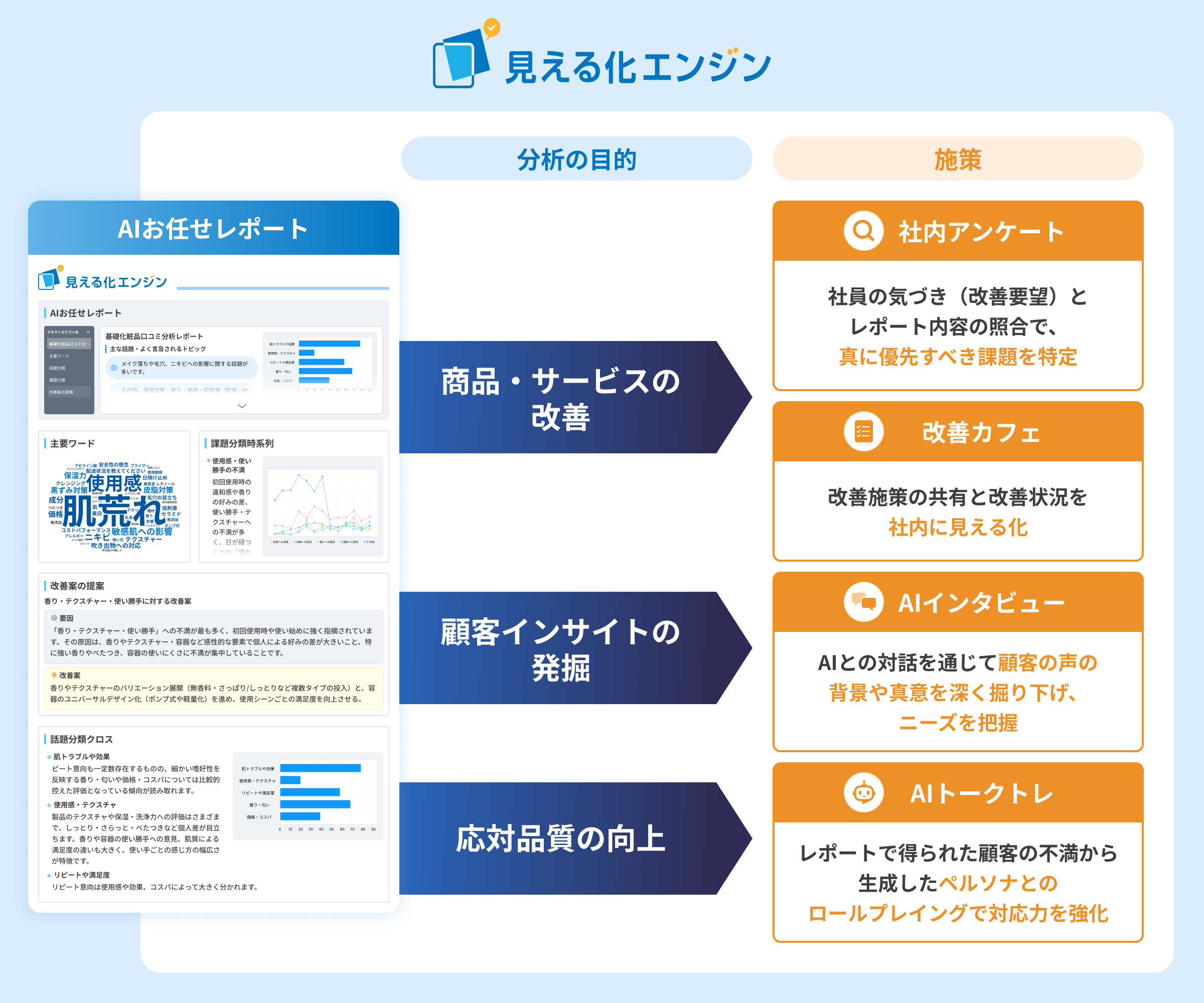 こうした背景から、当社は「見える化エンジン」に、データを入力するだけで自動的に分析レポートを生成する「AIお任せレポート機能」を搭載しました。この機能により、「データ収集 → 分析設計 → 分析 → 気づきや示唆の発見」という一連のプロセスを自動化し、顧客の声活用の効率化とクオリティの向上を実現します。