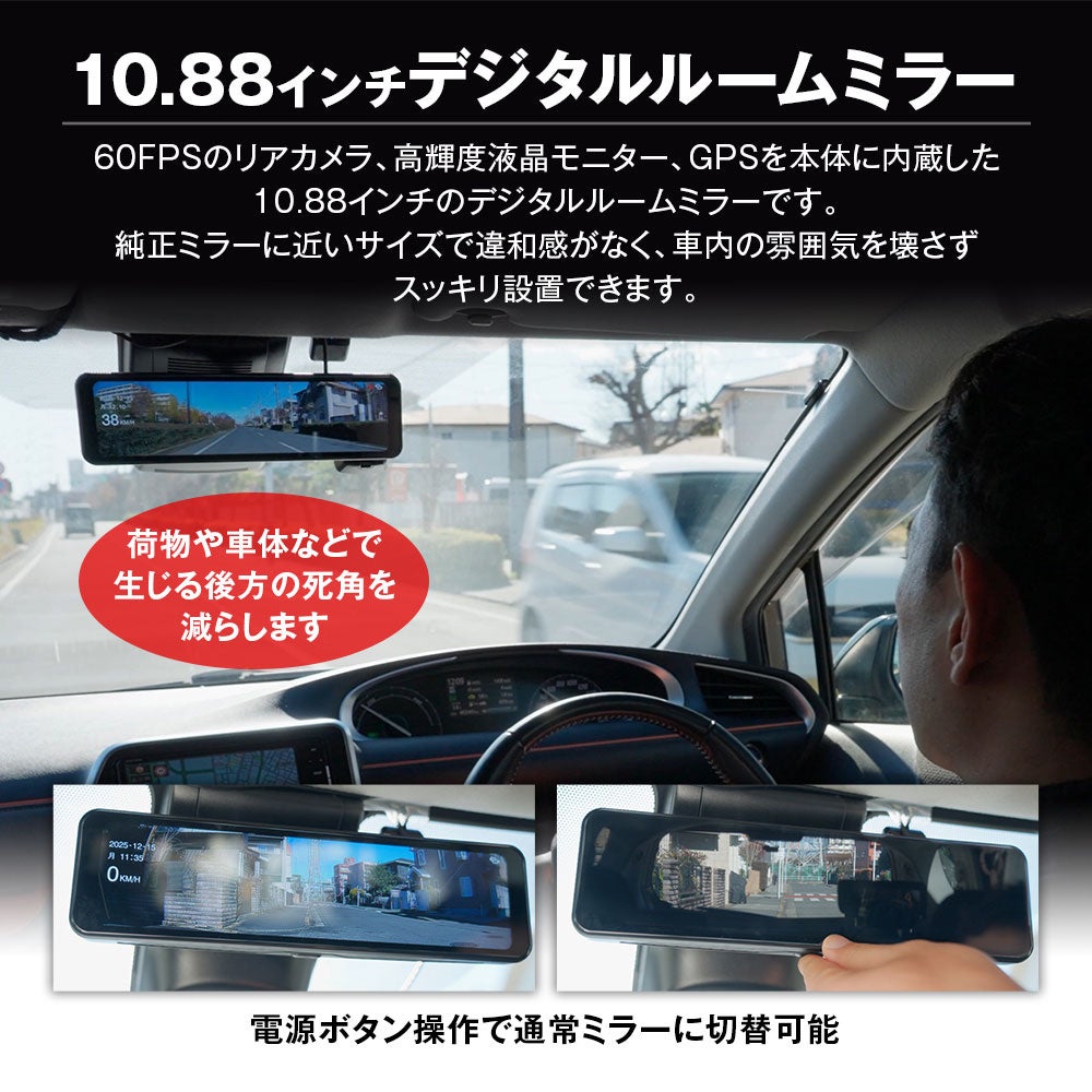 60FPSのリアカメラ、高輝度液晶モニター、GPSを本体に内蔵した10.88インチのデジタルルームミラーです。