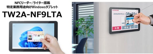 業務用情報端末メーカーのオーディーエス株式会社(本社:東京都千代田区、代表取締役社長:砂長潔)は、画面中央にNFCリーダー/ライターを搭載した10.1型Windowsタブレット「TW2A-NF9LTA」を2026年3月に発売します。本製品は、長期安定運用を実現する特定用途向け専用OS「Windows 11 IoT Enterprise LTSC 2024(64bit)」を標準搭載した業務用途向けモデルです。NFCリーダーを搭載しているので、外付けカードリーダーを使用することなくICカードをかざすだけで、マイナンバーカード(マイナ保険証を含む)の読取りによる本人確認や、入退室・勤怠管理、飲食店でのキャッシュレス決済端末としての利用など、NFCを活用して幅広い業務シーンに対応します。
