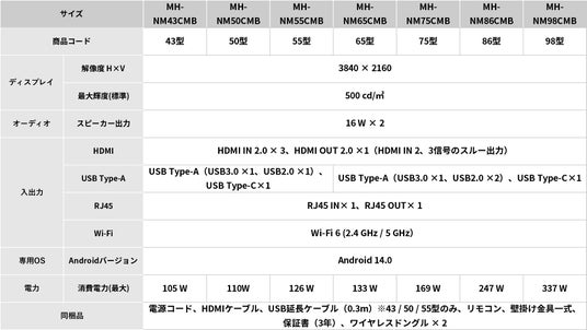 本商品は、PC・タブレット・スマートフォンからワイヤレスで画面投影を完了でき、情報共有を“誰でも迷わず”行えます。具体的には、 AirPlay/Miracast/Chromecast/専用アプリ「MAXHUB Share」/ワイヤレスドングル(2個付属)といった多様な投影方式に対応しており、前機種以上に環境に合わせて柔軟かつ容易に投影ができます。さらに、外部入力(HDMI/USB Type-C)映像をAndroid画面に小さなウィンドウを重ねて同時に表示する「PIP(Picture in Picture)」、左右に分割して同時に表示する「PBP(Picture by Picture)機能」が追加され、資料投影しながらWEB会議参加者の表情を見られるように。また、サイズラインアップは43~98型の7種類をご用意しており、会議室の規模に合わせて最適な商品をお選びいただけます。スピーカー出力は16W×2へ強化し、共有コンテンツの視聴・音声面でも会議体験を底上げします。ナイスモバイルは今後も、会議の流れを止めない環境づくりを通じて、企業のコミュニケーションの質向上と生産性向上に貢献し、会議DXを支援してまいります。