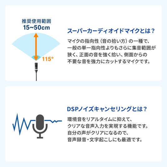 先進的なDSPノイズキャンセリングを搭載しており、空調音や打鍵音を最大40dB抑制します。MM-MCTC02NCはスーパーカーディオイドマイクを採用しており、正面の声をクリアに集音して周囲の雑音を最小限に抑えます。