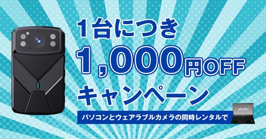 それに伴いスタートキャンペーンを実施、納品月のレンタル料が無料となるのに加え、さらにパソコンレンタルと同時利用でウェアラブルカメラのレンタル料を1台あたり1,000円割引致します。