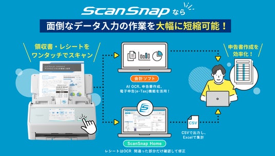 本展示会を主催するScanSnapは、確定申告に向けたレシート整理や、書類整理、名刺管理など、紙がゆえに煩雑になりがちな事務作業をデジタル化することで効率化するスキャナーです。専用ソフトウェア「ScanSnap Home」を用いたデータ整理や、各種クラウドサービスとの連携を通じて、効率的な情報整理・活用をサポートします。
