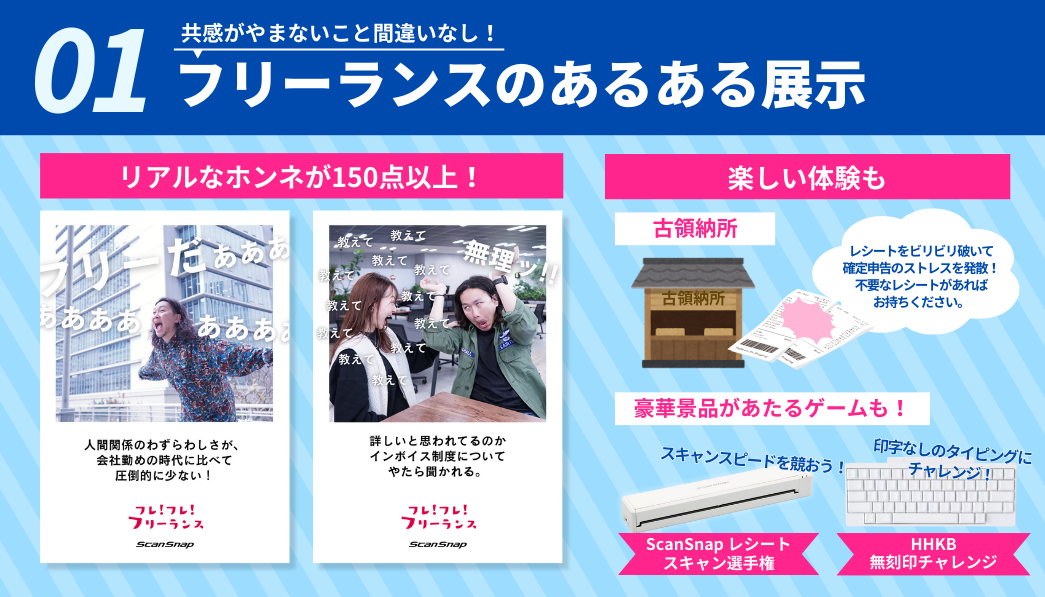 1.共感がやまないこと間違いなし!フリーランスの”あるある”展示フリーランスの皆様から募集した “あるある”を展示。