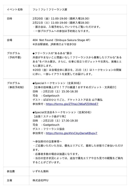 株式会社PFUが販売するイメージスキャナーScanSnapは、2026年2月20日、21日に、渋谷サクラステージ4F 404 Not Foundにて、『フレ!フレ!フリーランス展』(略称・フレフリ展)を開催します。