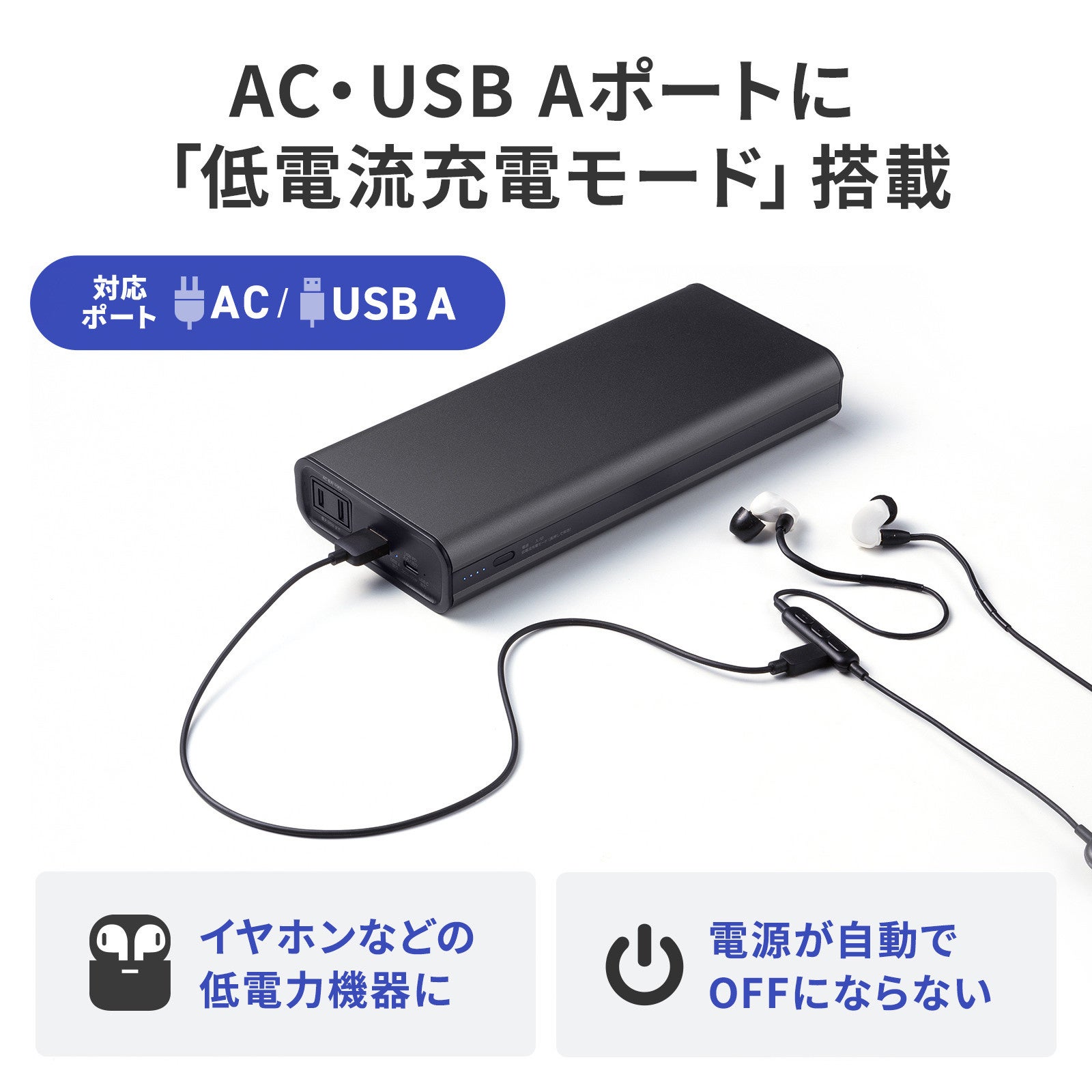 AC・USB Aポートは「低電流充電モード」に対応し、ワイヤレスイヤホンやウェアラブル機器などの充電電流が小さい機器でも、自動で電源が切れず安心して充電できます。※Type-Cポートは低電流充電モード非対応です。