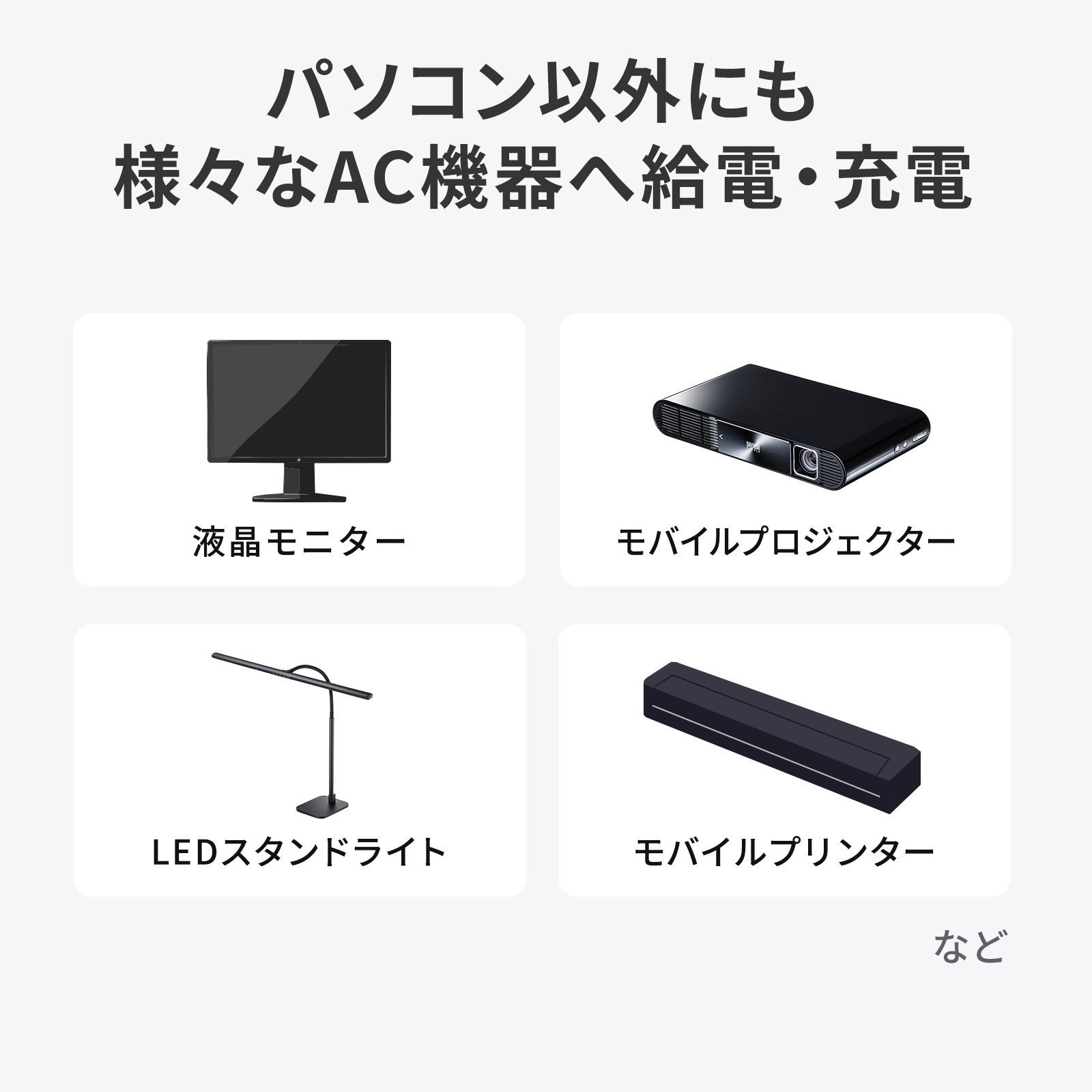 ACコンセントプラグを直接挿せるため、ノートパソコンへの給電に最適です。USB PD規格による最大65W出力にも対応しています。
