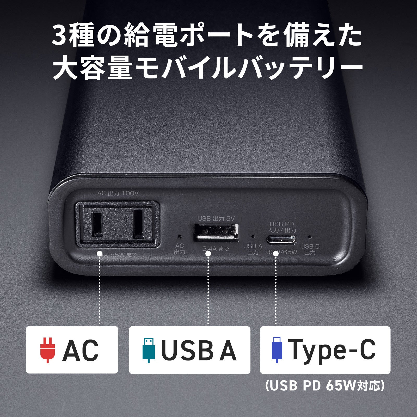 AC×1、USB A×1、Type-C×1と3種の給電ポートを搭載しており、様々な機器に対応します。容量27500mAh(並列換算値)の大容量モバイルバッテリーです。