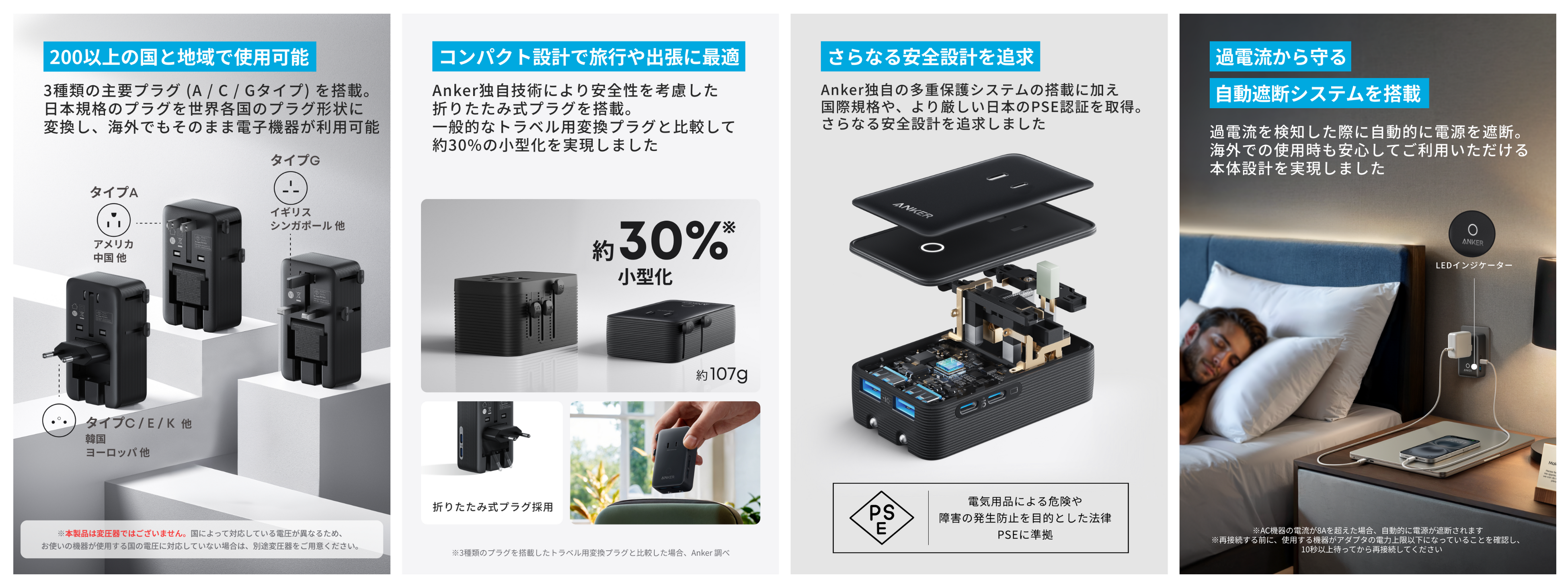 本製品は、海外旅行や出張に最適な【汎用性】【小型設計】【安全性】の3つが特徴のAnker初となるトラベル用変換プラグです。3種類のプラグを搭載し、A / C / G等の主要なコンセントタイプに合わせることができるため、200以上の国と地域(※1)で使用可能です。またAnker独自技術により、折りたたみ時に電源供給を遮断するプラグを搭載することで感電リスクを低減できる他、一般的なトラベル用変換プラグと比較して約30%の小型化(※2)も実現しました。さらに、過電流を検知すると自動的に電源を遮断する自動電源制御システム(※3)の搭載やPSE認証を取得しているため、海外への旅行や出張時も安全にご使用いただけます。