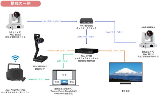 下図はAVerのリモートカメラ2台と、マルチカメラスイッチャー1台、書画カメラ1台、ポータブルマイク・スピーカー1台を「構成の一例」としたソリューションです。電子黒板の映像をMT300を経由して、遠隔授業/配信用PCに表示させることで、配信先の先生や生徒へ画面共有することも可能です。