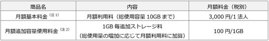 (注1)「月額基本料金」は総使用容量10GBのみになります。基本料金は1法人単位で、利用ユーザー数に応じて発生する追加料金はありません。