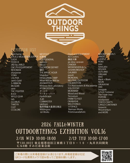 名称 :OUTDOOR THINGS EXHIBITION VOL.16会期 :2026年2月18日(水)~19日(木)10:00~18:00 ※最終日は17:00終了