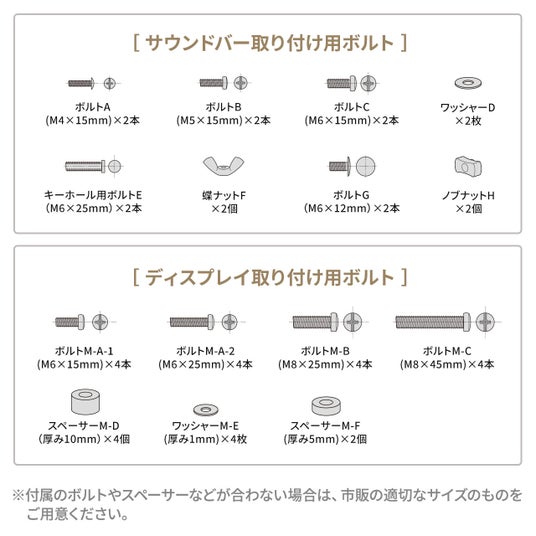 サウンドバーの固定は「背面ボルト穴」「背面キーホール」「底面ボルト穴」に対応。さらに固定穴がない機種でも、付属のL字ブラケットに載せて設置できます。機種ごとに異なりがちな取り付け仕様に柔軟に対応し、買い替えや機器追加の際も“使い続けやすい”汎用性を追求しました。
