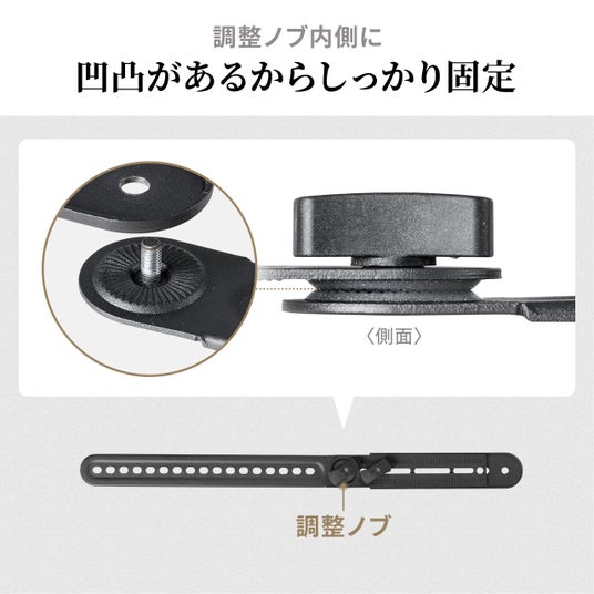 関節部分の長さや角度を調整でき、テレビやスピーカーのサイズに合わせて最適な位置にセッティング可能。アーム長は約55~67cmで、レイアウトの自由度も高めです。耐荷重は約5kgで一般的なサウンドバーをしっかり保持。必要なボルト・ワッシャー類も同梱しており、組み立てもスムーズです。