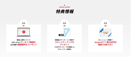 お申し込みいただいたすべての方は、後日アーカイブ動画をご視聴いただけるほか、当日ご視聴いただいた方には講演資料をご提供します。さらに、視聴後のアンケートにご回答いただくと累計3万ダウンロードを突破したセキュリティ指南本『セキュリティ 7つの習慣・20の事例』のPDFデータをお渡しします。