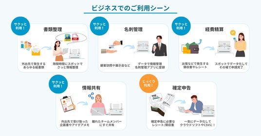 例えば、会議資料をその場でスキャンして離れたチームメンバーへ共有したり、展示会でもらったパンフレットをデータ化して持ち帰ったり、出先で受け取った名刺を整理したりすることができます。さらに、出張先で発生した請求書やレシートもその場でスキャンし、会社に戻らずに経費申請まで完了させることが可能です。確定申告前のご利用もおすすめです。