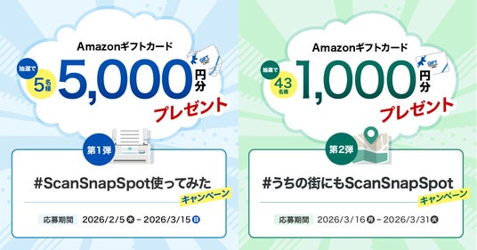 ScanSnap Spot運用開始に合わせて、以下2キャンペーンを実施します。第1弾は2月5日~3月15日に「#ScanSnapSpot使ってみたキャンペーン」、第2弾は3月16日~3月31日に「#うちの街にもScanSnapSpotキャンペーン」を開催します。