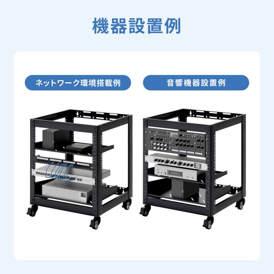 ネットワークスイッチや音響・録画・検査機器まで幅広く搭載できます。省スペース設計で、バックヤードや工場ライン、イベント会場など限られたスペースに効率よくマウントできます。
