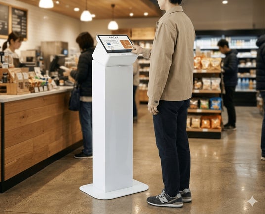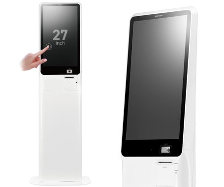 据え置き、カウンター設置、壁掛けの3パターンに対応。案内サイネージや発券機、セルフレジとして活用可能。