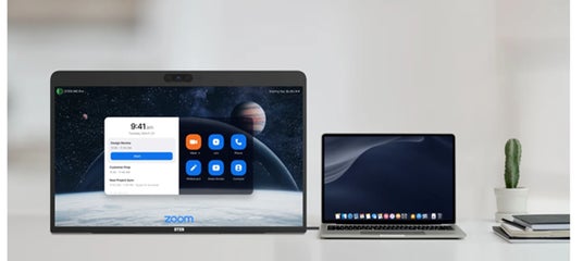 USB-Cケーブル1本でPCと接続でき、給電しながらカメラ・マイク・スピーカー・タッチを利用可能です。Zoomはもちろん、Direct Guest Join機能により、Microsoft Teams、Google Meet、Webexなど主要なWeb会議サービスにも参加でき、ハイブリッドワークに柔軟に対応します。