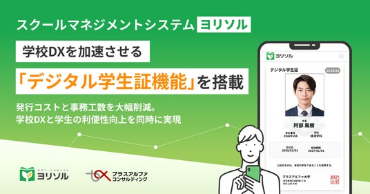 株式会社プラスアルファ・コンサルティング(本社:東京都港区、代表取締役社長:三室 克哉、証券コード:4071)は、スクールマネジメントシステム「ヨリソル」において、学籍情報をリアルタイムに同期し、煩雑な事務業務を効率化する「デジタル学生証機能」を搭載しました。