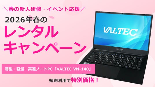 新入社員研修や春のイベントなど、一時的なパソコン利用コストを削減できる「春の短期パソコンレンタルキャンペーン」を2026年3月より開催します。法人専用14インチノートパソコン「VALTEC NoteBook VN-140(4500)」を対象に、期間限定の割引価格で提供します。