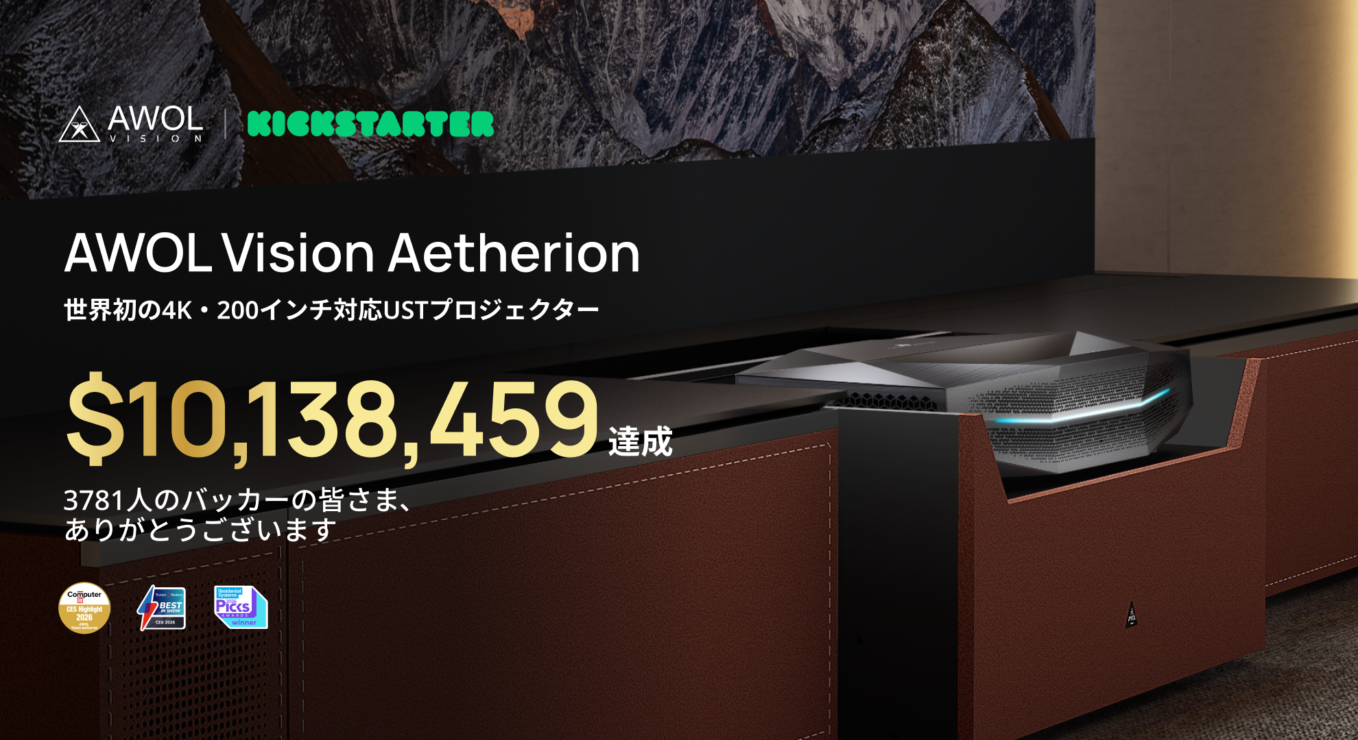 AWOL Vision(本社:米国フロリダ州、代表取締役:Andy Zhao)は、RGBレーザー投影技術に特化したハイエンド映像・音響ブランドとして展開する「Aetherion」シリーズの4Kトリプルレーザー超短焦点(UST)プロジェクターが、クラウドファンディングプラットフォーム「Kickstarter」において公開後、わずか12時間で3,781名の早期支援者を集め、支援は1,000万米ドル(約15億円)を超える好調なスタートとなったことを発表しました。この成果はAetherionシリーズの高い製品力を示すとともに、世界中の消費者が求めるプロ仕様で高いコストパフォーマンスを備えた大画面ホームエンターテインメント製品への需要と、AWOL Visionブランドの革新力が高く評価されていることを裏付ける結果となりました。特に日本市場では、厳しい品質基準を持つ消費者や業界関係者からも注目されており、同シリーズの登場は以前より大きな期待を集めています。