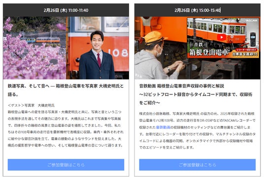 カメラ・写真/映像機器の展示会「CP+2026」のオンラインイベント内にて、写真家・大橋史明氏をお招きし、箱根登山電車の魅力やその収録をテーマとした2部構成のウェビナーを2月26日(木)に開催いたします。