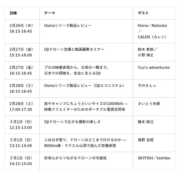最新のDJI製品のタッチ&トライやゲストによるトークショーを実施します。来場者限定のノベルティやプレゼント企画も!