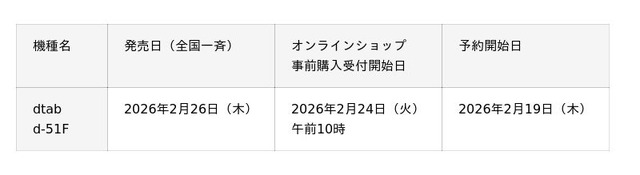 「dtab d-51F」を2026年2月26日(木)に発売いたします。発売に先立ち、2026年2月19日(木)