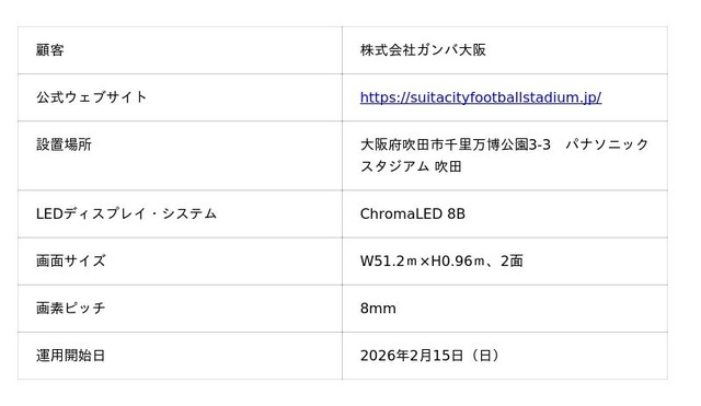 ヒビノ株式会社(本社:東京都港区、代表取締役社長:日比野晃久)は、プロサッカーチーム・ガンバ大阪の本拠地「パナソニック スタジアム 吹田(Panasonic Stadium Suita)」へ、当社製の8mmピッチLEDディスプレイ・システム「ChromaLED 8B」を納入いたしました。当社は2023年に同スタジアムへ2面の大型ビジョンを納入しており、その映像品質の高さと、導入以来の屋外における長期安定稼働が高く評価され、今回の追加採用に至りました。