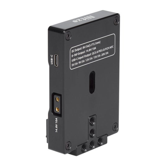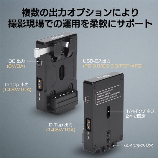 標準的なVマウントバッテリーに対応し、USB-C、DC、D-Tapの電源出力端子を備えたバッテリープレートです。2本の1/4インチネジで固定します。