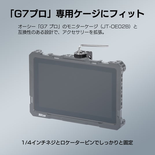 オーシー「G7プロ」の機能を最大限に引き出し、撮影現場での運用をサポートするために設計された専用ケージです。本体は丈夫なアルミニウム合金製で、上下の2本の1/4インチネジでモニターをしっかりと固定し、優れた拡張性を実現します。