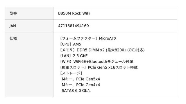 B850M Rock WiFi | ASRock(アスロック) Socket AM5 AMD B850 MicroATX WiFi+Bluetoothモジュール付属 マザーボード