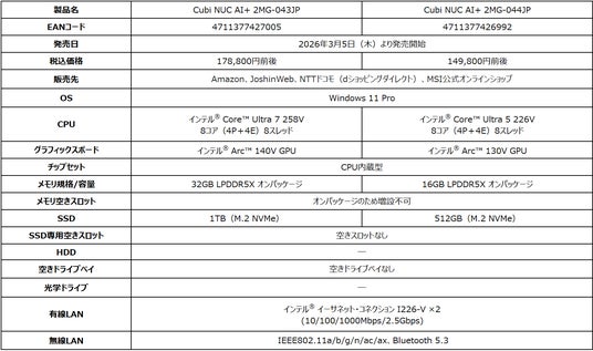 この度、エムエスアイコンピュータージャパン株式会社は2026年3月5日(木)より新たな製品を発売開始します。高いAI処理能力を備えたCopilot+ PCとしての機能を備え、インテル(R) Core(TM) Ultra 7 258V、メモリ32GB、 Thunderbolt(TM) 4、2.5G ×2のデュアルLAN、Wi-Fi 6Eなど充実の機能を搭載し、業務効率化と快適な作業環境を実現する「Cubi NUC AI+ 2MG-043JP」、インテル(R) Core(TM) Ultra 5 226V、メモリ16GB搭載の「Cubi NUC AI+ 2MG-044JP」が新たにラインナップに加わります。