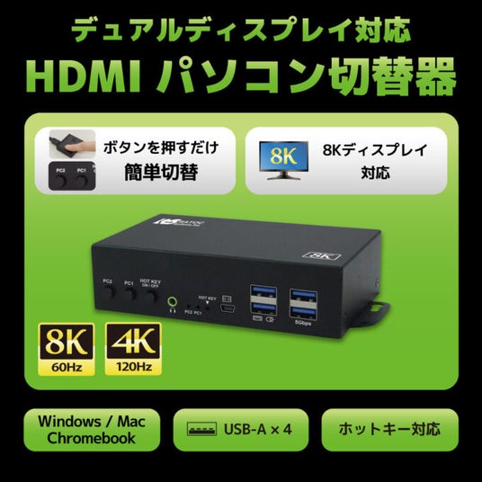 8K/4Kデュアルディスプレイ環境のままパソコンの切り替えができる切替器。