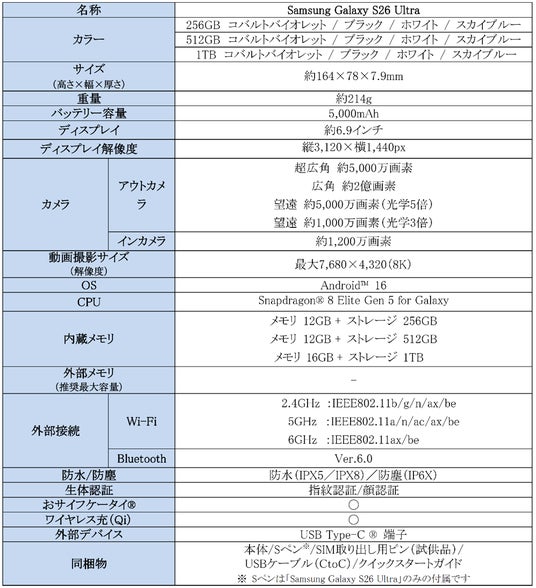 <主な仕様:「Samsung Galaxy S26 Ultra」>