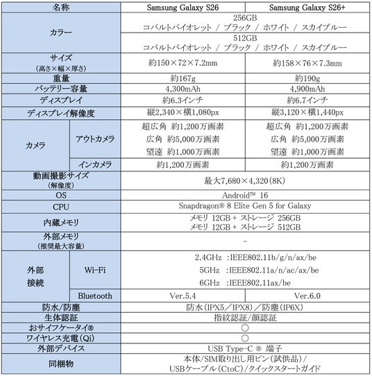 <主な仕様:「Samsung Galaxy S26」、「Samsung Galaxy S26+」>