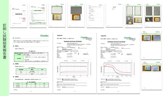 - 穿刺試験:5.0mm鋼針による貫通時、最高温度は39.7℃であり、火災や爆発は確認されませんでした。