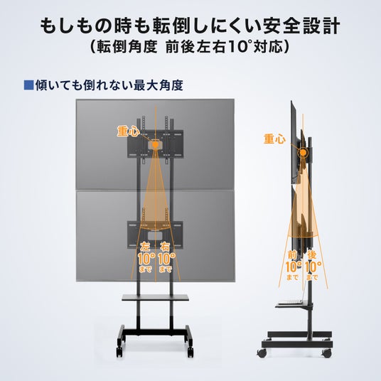 前後左右に10度まで傾いてしまっても転倒しないよう設計されています。JIS規格の基準をクリアしており、2画面設置時でも安心して使用できます。※1ヵ所あたり、65型、30kg相当ディスプレイ装着時の条件です。