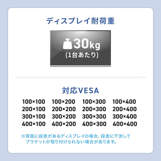 65型サイズ・重さ30kg(1台あたり)までのディスプレイを設置可能です。VESA400×400mmまでの幅広い機器に対応しています。