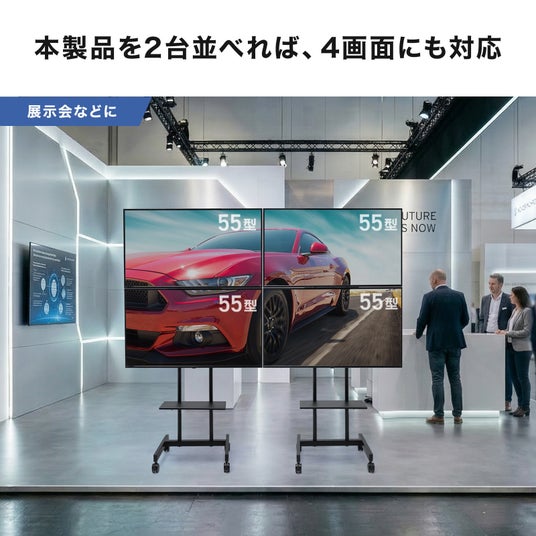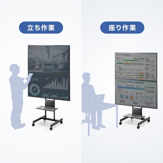工場内の工程管理や監視カメラ管理画面、展示会や店舗のサイネージを省スペースで強化でき、移動や高さ調整にも柔軟に対応可能です。