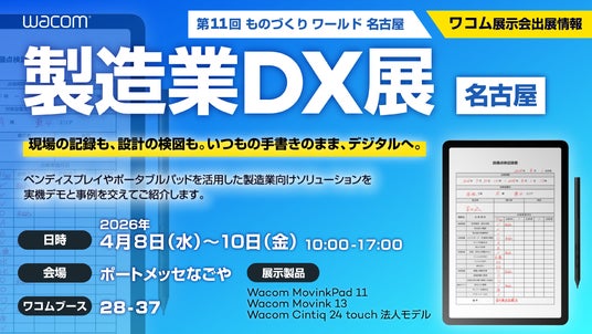 株式会社ワコムは、2026年4月8日(水)から10日(金)までポートメッセなごやで開催される「ものづくりワールド名古屋 製造業DX展」に出展します。ワコムブース(小間番号:28-37)では、液晶ペンタブレットやポータブルパッドを活用し、設計図面レビューや現場業務のペーパーレス化を実現するソリューションをご紹介します。