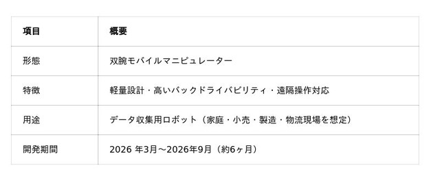 株式会社Keigan(本社:京都府相楽郡精華町、代表取締役:徳田 貴司、以下「Keigan」)は、一 般社団法人AIロボット協会(AIRoA)が主催する「国産汎用ロボット開発コンペティション」 (NEDO委託事業の一環として実施するもの※)に採択されたことをお知らせします。 本コンペティションは、日本のロボット産業の競争力強化を目的に実施されるものであり、Keigan は2026年3月より双腕モバイルマニピュレーターの試作機開発・製造に取り組みます。